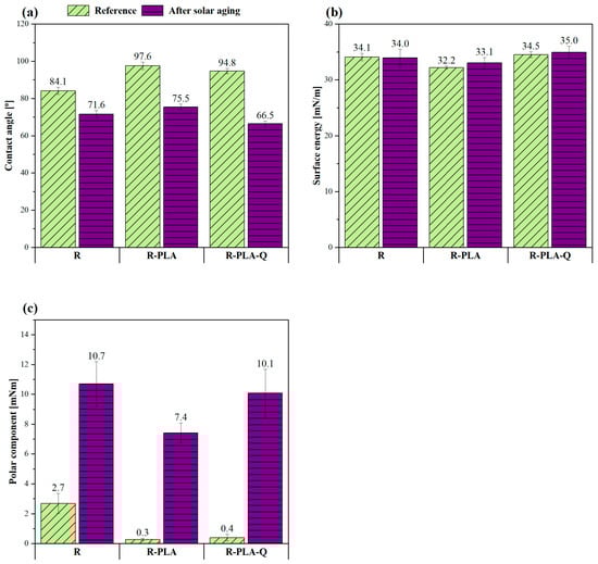 Changes in water contact angle values (a), surface energy (b), and its polar component (c) caused by 800 h of solar aging. R—epoxy resin; PLA—polylactide; Q—quercetin.