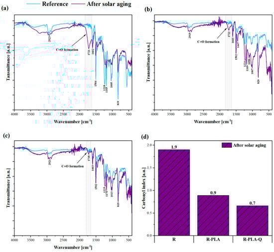 FTIR spectra of (a) pure epoxy resin; (b) epoxy resin—PLA; (c) epoxy resin—PLA—quercetin, before and after 800 h of solar aging; and (d) carbonyl index values determined for all samples after aging.