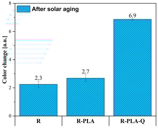 When analyzing changes in the lightness index (L*) values before and after aging, no significant changes were noted in the case of the reference resin sample and with the addition of polylactide, while for the R-PLA-Q material, the value of this parameter decreased as a result of solar aging. This means that it has become much darker. Additionally, for all samples, there was an increase in the value of the a* parameter, denoting a color shift of these materials towards shades of red. Analyzing the values of the b* parameter before and after the aging process, it is visible that in the case of the reference resin sample and with the addition of polylactide and quercetin, these values decreased, which means a color change more towards shades of blue, while for the R-PLA composite, there was a change towards shades of green. The greatest color change (6.9), which was easily noticeable for a potential observer, was obtained for the R-PLA-Q material, which could be directly related to the oxidation reactions occurring in this polyphenol. According to the available literature, flavonoids such as quercetin exhibit strong antioxidant properties due to the presence of numerous double bonds and hydroxyl groups in their structure, thanks to which they can act as scavengers of free radicals, reacting with them under the influence of various atmospheric factors, including UVA and UVB radiation []. At the same time, an oxidation reaction takes place in the structure of these compounds, which changes their coloration. Such behavior of quercetin allows for longer preservation of the properties of the polymer matrix and thus the use of the polymer product.