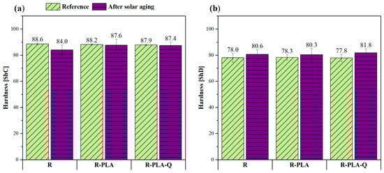 Results of hardness tests on the Shore “C” scale (a) and on the Shore “D” scale (b) before and after solar aging.