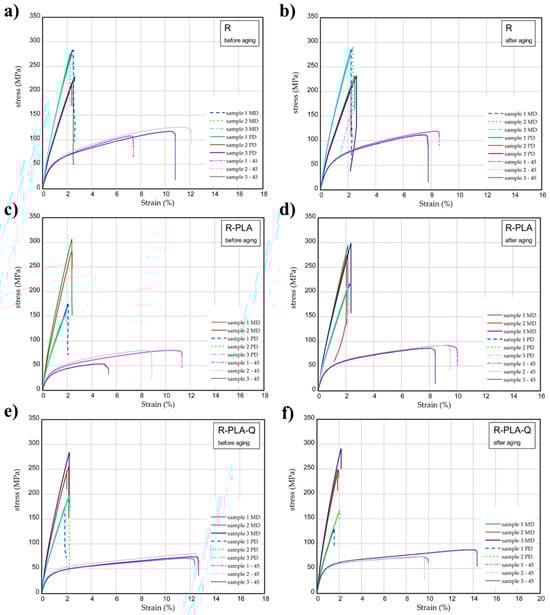 The results of tensile tests of samples examined before and after the aging process are illustrated in Figure 8. The mechanical parameters were determined for three directions (MD, PD, and 45). Figure 8a,b present the strain expressed in % vs. normal stress in MPa for the reference sample. The maximum stress and Young’s modulus for MD samples were 277–283 MPa and 17.3–18.3 GPa, respectively. In the case of PD samples, these values obtained were lower by 15–20% in comparison to MD samples. Taking a look at the 45 samples, the mechanical parameters are lower (usually about two times). After the solar aging process, the strength of composite seems to be higher (Figure 8b). Characteristic parameters of analyzed samples were inserted in Table 6. Analyzing the next charts (Figure 8c–f), in general, the presence of PLA in samples causes a slight growth in the strength and stiffness, but the addition of 2 wt.% of quercetin can lower the mechanical parameters even after solar radiation.