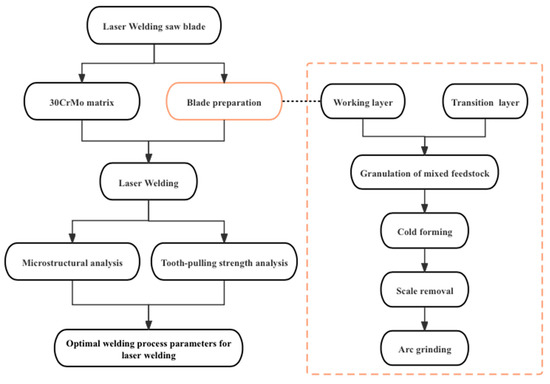 The main flow of this study is shown in Figure 1; in this experiment, 4 to 5 sets of saw blades were prepared based on different welding process parameters and a tooth-breaking test was conducted to obtain experimental results. Considering that the preparation of metallographic samples requires a set of saw blades, while the calculation of tooth-breaking strength and the examination of post-tooth-breaking morphology necessitate three sets of saw blades. To ensure the repeatability and accuracy of the research findings, multiple sets of saw blades were prepared during practical operations, taking into account the potential occurrence of issues during sample preparation. The diamond and pre-alloy powder in the working layer were mixed for 2~3 h in the 3D mixture machine. Then, the spherical particles were prepared with a granulating agent with 5% wt by sifting method.