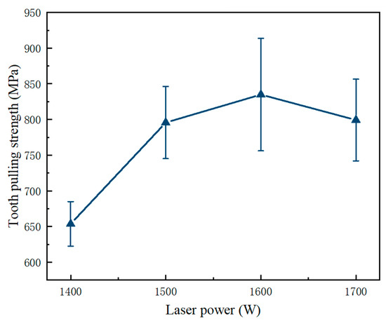 During the high-speed cutting process of diamond saw blades, welding strength is a crucial parameter for their safety. Typically, the welding strength is characterized by destructive bending strength (tooth-pulling strength) [33,34]. Figure 4 illustrates the effects of laser power on the tooth-pulling strength of the welded joint between the diamond saw blade head and substrate. At a laser power of 1600 W, the tooth-pulling strength reaches its maximum value of 819 MPa. The average tooth strength of 819 MPa is achieved under the welding process characterized by a laser power of 1600 W and a welding speed of 1400 mm/min. In the absence of any variations in the composition of the transition layer or sintering process parameters, or the dimensions of the cutting tool and substrate, it is deduced that the welding process parameters singularly influence the tooth strength. As the laser power increases from 1400 W to 1600 W, there is a gradual improvement in tooth-pulling strength.