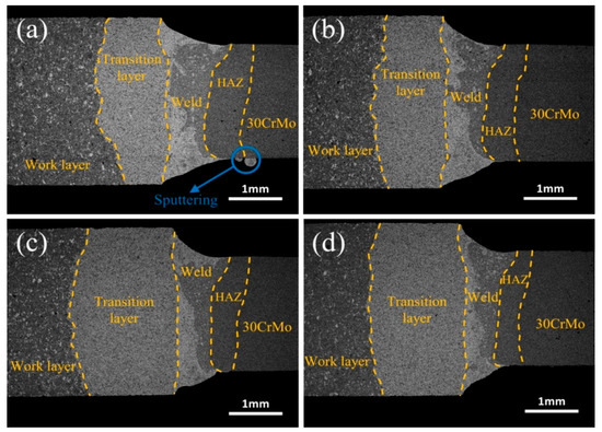 Effect of welding speeds on the weld morphology between diamond saw blade head and substrate: (a) 1200 mm/min; (b) 1400 mm/min; (c) 1600 mm/min; (d) 1800 mm/min.
