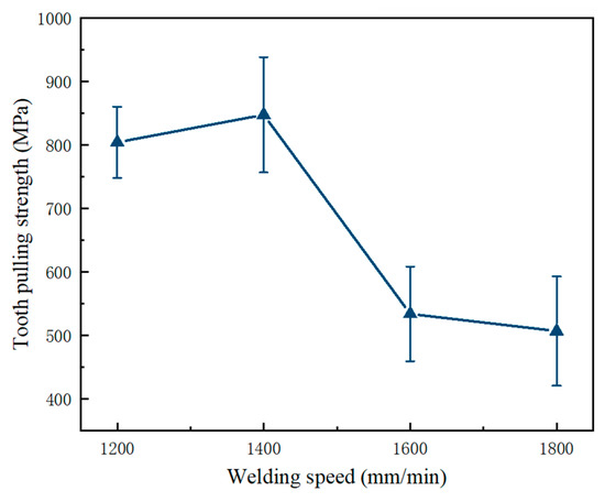 In laser-deep penetration welding, the welding speed plays a crucial role in determining both the welding depth and the tooth-pulling strength when the laser power stays constant [18,35]. A higher welding speed leads to shallower melting, hindering the quick escaping of gas from the molten pool and consequently generating numerous pores, which decrease tooth-pulling strength. Conversely, a slower welding speed can cause excessive melting of the transition layer, expanding the heat-affected area and coarsening the microstructure. When adequate depth can be ensured, the choice of a higher welding speed can increase production efficiency and reduce costs. Moreover, lower welding speeds can lead to excessive heat input, and deterioration in the microstructure and performance of the weld, and even the appearance of macroscopic cracks.