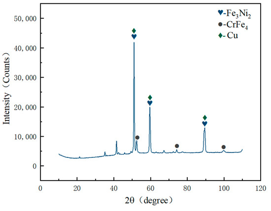 According to the micro-XRD pattern of the laser-welded joint melting zone in Figure 10, it can be observed that the melting zone is composed of Cu solid solution phase and intermetallic compound phases such as Fe3Ni2 and CrFe4. Figure 10 depicts the phase distribution, revealing that the grains in the transition layer and molten zone (rich Cu area and rich Fe area) possess an FCC crystal structure. This outcome further confirms that the crystal structure of the Fe3Ni2 and CrFe4 phases detected in the micro-area XRD pattern is indeed an FCC structure. The presence of these compound phases results in solid solution strengthening on the welded joint, thereby enhancing blade tooth strength.