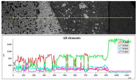 Figure 12 illustrates the findings of the line scan analysis conducted along the transverse direction of the weld metal. The analysis reveals a gradual increase in the mass fraction of the Fe element from the transition layer and melting zone to the heat-affected zone. Conversely, the mass fractions of Cu, Ni, and Cr elements progressively decrease until they become negligible. The elements in the transition layer area appears disordered. Notably, the variation pattern of Ni and Cr elements on the transition layer side of the melting zone aligns with that of Fe, but contrasts with that of Cu. Additionally, in the melting zone near the substrate side, the mass fraction of Fe increases while that of Cu decreases. Remarkably, the heat-affected zone exhibits a significantly high mass fraction of Fe, reaching up to 98%.