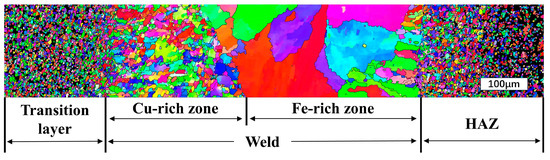 The grain size and orientation of laser-welded diamond saw blade joints were analyzed using EBSD [38,39], and the results are presented in Figure 13, Figure 14 and Figure 15. Figure 13 illustrates the IPF diagram of a 1600 w × 1400 mm/min welded joint. It can be observed from the figure that both the Cu-based transition layer area and the 30CrMo matrix area consist of fine grains, exhibiting a disordered color distribution and random grain orientation. The melting zone is divided into two regions by the boundary formed during the initial liquid phase separation of Fe and Cu. Due to the sintering of the Cu-based transition layer from pre-alloyed powder particles, it is evident that the grain size in the left Cu-rich zone is significantly smaller than that in the right Fe-rich zone. However, both zones exhibit larger grain sizes compared to those found in their respective base materials. The melting zone exhibits columnar dendrites, which grow in the opposite direction of the temperature gradient and lack a distinct preferred orientation. This columnar crystal structure is likely attributed to the rapid cooling rate and high undercooling level during laser welding.