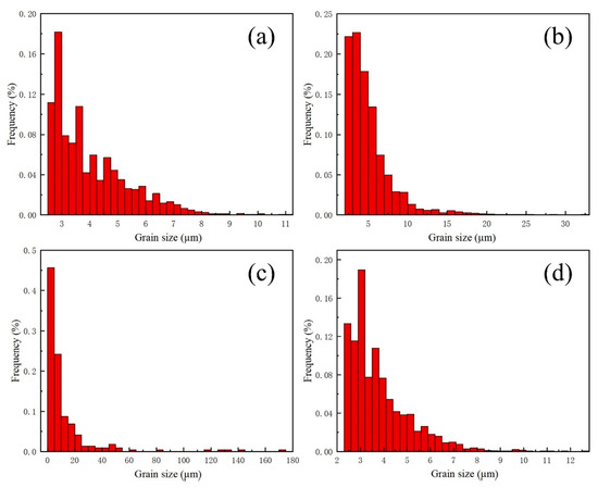 The grain size distribution of the welded joint between the diamond saw blade and matrix. (a) Grain size in transition layer; (b) grain size in melt zone side; (c) grain size in substrate side; (d) grain size in matrix heat-affected zone.