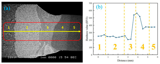 Microhardness of laser-welded diamond saw blade weld seam: (a) measurement points; (b) microhardness distribution.