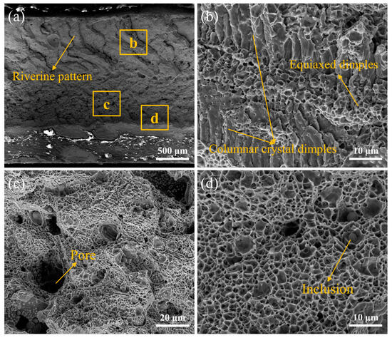 The fracture surface is composed of dimple and local cleavage facets. By referring to the schematic diagram of trigger teeth, it becomes evident that shear stress is initially experienced by the cutting head, resulting in a river-like pattern at the upper end of the sample. As tooth pulling progresses, tensile stress occurs in the middle region of the blade and equiaxed dimples are formed. Finally, at the lower end, shear stress causes fracture with shallow dimples. Figure 17b shows the fracture feature of columnar crystal dimples at the upper and lower ends, and the fracture feature of equiaxed dimples in the middle. In Figure 17c, many pores are produced, which may be due to the presence of phases with lower melting points in the transition layer during laser welding. These pores cause stress concentration within welded joints and consequently decrease their strength. A number of criteria, including adequate joint design, effective shielding gases, and careful selection of welding parameters (e.g., laser power, travel speed, and focal location), should be taken into account in order to prevent porosity in laser welds and achieve the requisite stability. In order to reduce porosity formation, it is also critical to minimize impurities, maintain constant welding conditions, and ensure clean and adequately prepared surfaces. Furthermore, numerous inclusions within ductile dimples also affect welding strength.