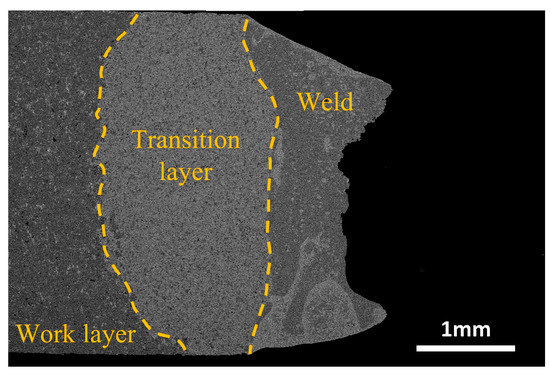 Laser-welding technology offers a promising approach to prepare diamond tools by welding a tool head, containing a metal binder and diamonds sintered through powder metallurgy, onto a steel matrix [15]. Laser-welding diamond saw blades exhibit advantages such as deep penetration, high efficiency, and a large fusion area [16]. These blades are not affected by air pollution and can withstand significant impacts at high temperatures [17]. However, direct welding of diamond segments onto the substrate often results in the presence of numerous pores and cracks, leading to an inadequate joining strength [18]. The effective joining of diamond composite materials and metal substrates using laser welding poses challenges due to the significant thermal mismatch and the formation of brittle intermetallic compounds [19]. One potential solution to address these challenges is the introduction of a transition layer, which provides a gradual change in material properties, reduces thermal stress, and promotes metallurgical bonding between the diamond composite and metal substrate. The addition of a transition layer, typically with a thickness of 1~2 mm, has proven effective for preparing laser-welded saw blades.