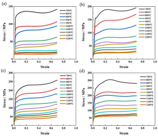 True stress–true strain curves at different deformation temperatures and the same strain rate: (a) 0.01 s−1; (b) 0.1 s−1; (c) 1 s−1; (d) 10 s−1.