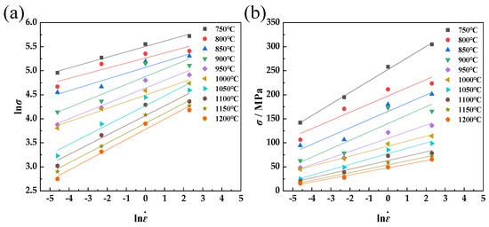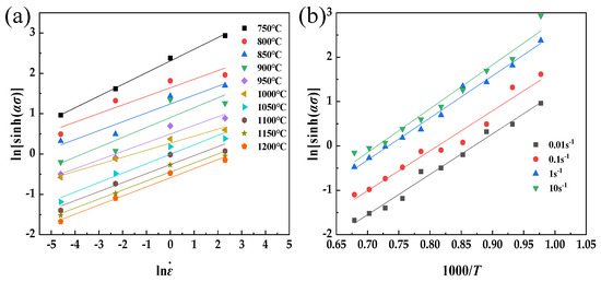 A, n, β, and α are all material constants that are independent of temperature, where A is the structure factor (s−1), n is the stress exponent, β = nα, and α is the stress factor (MPa−1); Q is thermal deformation activation energy (kJ·mol−1), also known as dynamic softening activation energy, which reflects the equilibrium relationship between work hardening and dynamic softening during thermal deformation; R is the gas constant (8.3145 J·mol−1·K−1); is the strain rate (s−1); σ is flow stress; and T is the thermodynamic temperature (K).