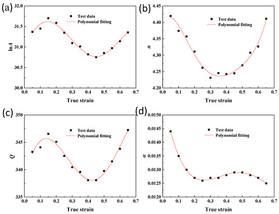 Variation of material constants with true strain: (a) lnA; (b) n; (c) Q; (d) α.