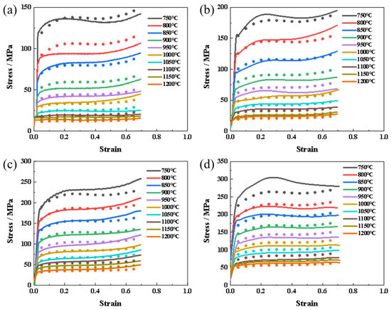 Comparison of experimental and predicted stress–strain values for FeCrAl alloys at different temperatures and strain rates: (a) 0.01 s−1; (b) 0.1 s−1; (c) 1 s−1; (d) 10 s−1. (Dots represent the test data, while lines display the polynomial fitting).