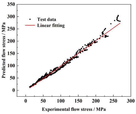 To validate the accuracy of the strain-compensated constitutive equation, the experimental values of peak stresses under various deformation conditions were compared with the calculated values. Figure 7 shows the correlation between the predicted stress and the test stress after linear fitting. The square correlation coefficient R2 of the test value and the predicted value was up to 0.987, indicating that the predicted data have a good correlation with the test data.