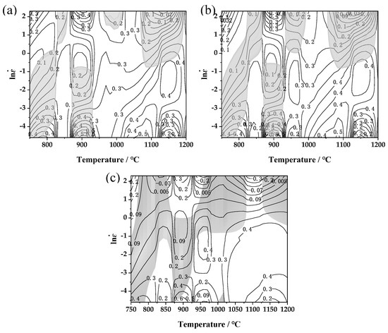 Hot processing map under different true strains: (a) 0.22; (b) 0.36; (c) 0.69. (Grey shadow represents the instability region).