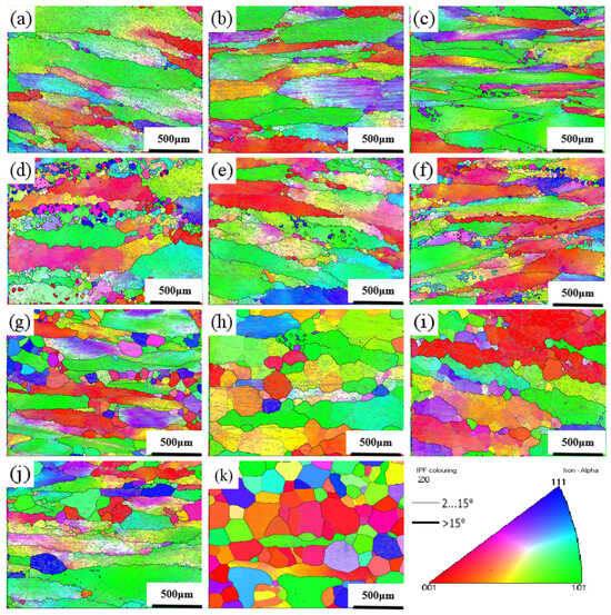Crystal orientation diagram at different temperatures and different deformation rates: (a) 900 °C-0.01 s−1; (b) 950 °C-0.1 s−1; (c) 950 °C-1 s−1; (d) 1000 °C-0.01 s−1; (e) 1050 °C-0.1 s−1; (f) 1050 °C-1 s−1; (g) 1050 °C-10 s−1; (h); 1150 °C-0.01 s−1 (i) 1150 °C-0.1 s−1; (j) 1150 °C-1 s−1; (k) 1150 °C-10 s−1.