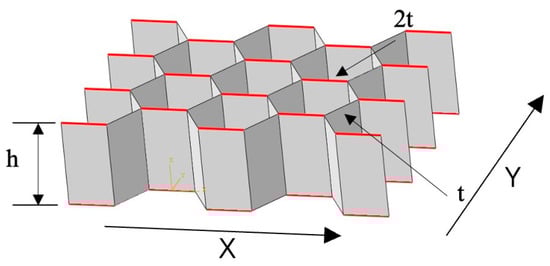 The sample for testing was a honeycomb sandwich panel, which consisted of two identical surface papers that were bonded to the upper and lower sides of a hexagonal honeycomb core. The height of the sample was determined by adding the height of the honeycomb core to the thickness of the surface papers. The honeycomb core had a fixed height of 30 mm. The thickness of the honeycomb sandwich panel was adjusted by varying the thickness of the honeycomb paper core. Table 1 provides details on the quantification and thickness of the face paper and core paper. Figure 1 shows the individual honeycomb cell of the honeycomb core as a regular hexagon with a side length of 8 mm. A single honeycomb core, neglecting the influence of adhesive, was composed of two honeycomb walls with a thickness of 2 t and four honeycomb walls with a thickness of t. The hexagonal honeycomb exhibited strong anisotropy, with an angle of 120° between the honeycomb walls.
