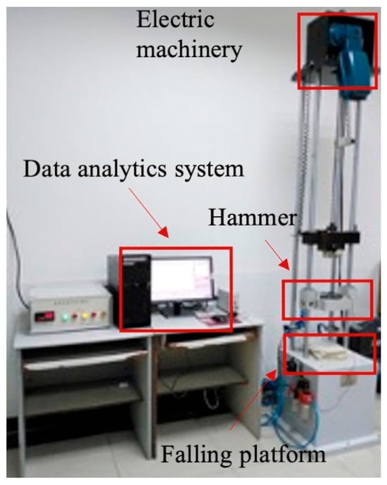 Specimens with a size of 100 mm × 100 mm were fabricated using honeycomb sandwich panels following ASTM-D7766 standards [23]. Before conducting dynamic impact tests, the specimens were conditioned to meet the requirements of standard PN-EN20187:2000 for a duration exceeding 48 h [24]. The impact experiments were carried out using Y52-2/77 (Xian Guangbo Testing Equipment Co., Ltd., Xi’an, China) equipment for testing cushioning materials, as depicted in Figure 2. The composition of the buffer testing apparatus primarily includes a falling platform, an electric machine, a hammer, and data analytics system. Additionally, the experimental device is supplied with pneumatic control attachments to prevent the secondary impact of the punch on the specimen. During the initial impact, test data were generated to ensure the accuracy and reliability of the data. Each experiment was replicated five times under identical conditions. The mass of the impact hammer was adjusted to 7 kg, 8 kg, and 9 kg. The initial energy was autonomously adjusted by altering the drop height by 50 mm. Following each impact, the pulse data acquisition software automatically recorded and analyzed the necessary impact reaction parametric quantities, for instance, the impact acceleration time curve.
