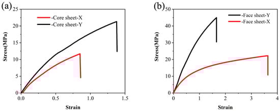 Stress–strain curve of the tensile test: (a) core sheet; (b) face sheet.