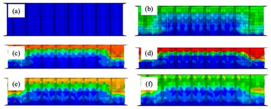 Figure 6 shows the results of the dynamic impact finite element simulation on honeycomb sandwich panels, showing the deformation states at various time points. The figure’s color differences correspond to the different levels of stress, where blue indicates the lowest level of stress and red the highest level of stress.