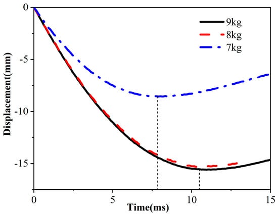 The way in which sandwich panel structures deform and their ability to absorb energy are significantly impacted by the velocity and energy of the impacting force during a drop. In Figure 7, the curve depicts the displacement of the hammer over time, with the upward lifting direction designated as positive and the downward falling direction designated as unfavorable. The displacement curves of the three different masses of hammers exhibit a consistent trend: initial downward impact to maximum compression displacement followed by upward rebound. The experiment’s dynamic buffering machine, equipped with an inflation device to prevent the hammer dropping a second time on the material, resulted in a displacement curve that passed the peak moment, obscuring the precise observation of displacement value changes. The data analysis revealed that weights of 7 kg, 8 kg, and 9 kg impacting the honeycomb sandwich panel yielded displacement peaks of −8.52 mm, −15.2 mm, and −15.7 mm, respectively. The displacement value of 9 kg relative to 7 kg increased by 7.18 mm, while the displacement peak at 8 kg did not significantly differ from that at 9 kg. The error analysis suggested that the sample’s maximum impact load tolerance was between 7 kg and 8 kg. Beyond this threshold, the sample could not withstand excessive loads, leading to heightened damage.