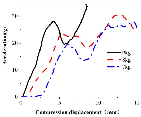 The dynamic cushioning performance of materials is usually characterized by peak acceleration. Figure 8 shows the acceleration compression displacement curve of a heavy hammer. Taking the 7 kg weight as an example, the maximum acceleration reached 19.5 g, the maximum acceleration corresponding to the 8 kg weight was 23.4 g, and the maximum acceleration corresponding to the 9 kg weight was 28.19 g. Compared to those of the 7 kg weight, the acceleration of the 8 kg and 9 kg weights increased by 20% and 44.5%, respectively. The slope of the acceleration curve of the 9 kg weight was also greater than that of the 7 kg and 8 kg weights, and the speed of change significantly increased. Under certain impact conditions, the panel received the transmitted impact energy, and the acceleration of the hammer gradually increased from zero. After reaching the peak, the core paper gradually absorbed the impact energy due to buckling, resulting in a gradual decrease in acceleration. Compared with those of traditional laminated panels, the energy absorption characteristics of honeycomb sandwich panels are significantly improved [28,29]. As the compression displacement increased, the honeycomb sandwich panel was gradually compacted, causing stress concentration and increasing the acceleration of the heavy hammer again. A time history analysis revealed that the 7 kg hammer reached its displacement peak at 7.8 ms, whereas the 9 kg hammer reached its peak at 10.85 ms. Smaller impact loads reach their peaks faster than larger loads, resulting in deeper compression of the cushioning material. An increase in the impact load prolongs the impact process, allowing the cushioning material to absorb the impact energy more fully. The data indicate that an increase in the impact load led to more significant compression displacement, increasing the deformation of the honeycomb panel. There was a maximum load-bearing range for the specimen, and surpassing this range rapidly increased damage. When designing and applying sandwich panel structures, it is imperative to consider and limit the level of impact load to ensure the required structural stability and performance in practical use.