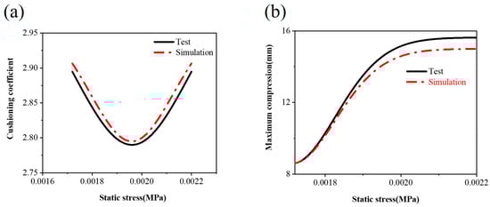Comparison of the (a) static stress–cushioning coefficient and (b) static stress–maximum compression simulation experiments.
