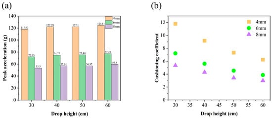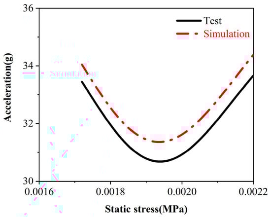 A comparative analysis was conducted using experimental and simulation data to enhance the model’s credibility. Figure 11 and Figure 12 present the comparison charts for the cushioning coefficient, maximum compression, and acceleration derived from the experimental and simulation results. The overall trend is relatively consistent between the two datasets. The specific error analysis results for the experimental and simulation data are detailed in Table 4, where the error for the acceleration is 2.2%, the error for the maximum compression is 3.4%, and the error for the cushioning coefficient is 3.7%. All the error values fall within the 5% range, indicating that the simulation model accurately simulated the experimental conditions with high precision and reliability. This provides a dependable reference basis for further predictions and optimizations of structural models.