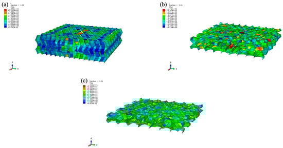 In logistics processes, the honeycomb sandwich material serves as a representative cushioning and energy-absorbing protective material [30]. Building upon existing research, this study forecasts the dynamic cushioning performance of three distinct honeycomb cell lengths under various conditions and subsequently compares and analyzes the experimental outcomes. A stress nephogram depicting three types of honeycomb sandwich panel core paper with cell edge lengths of 4 mm, 6 mm, and 8 mm is illustrated in Figure 13. To better observe the force of the honeycomb core sheet, the upper and lower layers of the face sheet are concealed. The initial thickness of the sample was 30 mm, and it was compressed to final thicknesses of 26.82 mm, 15.39 mm, and 12.35 mm.