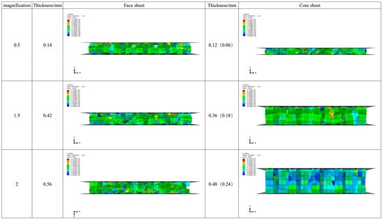 Stress nephograms of honeycomb sandwich panels with different thicknesses of face paper and core paper.