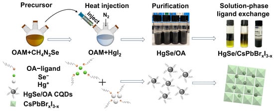 The fabrication of HgSe CQDs and the solution-phase ligand exchange method are depicted in Figure 1. Initially, mercury and selenium were dissolved in OA, preparing the precursors. The selenium precursor was then cooled to ambient conditions, whereas the mercury precursor remained at 115 °C. The selenium was gradually introduced into the mercury solution, culminating in the synthesis. The resultant HgSe CQDs, purified via centrifugation and extraction, were then mixed in precise ratios with CsPbBrxI3-x solutions. A vortexing step facilitated the HgSe CQDs’ transition to the DMF phase, after which they were collected by centrifugation and redispersed in a BTA-DMF solution.