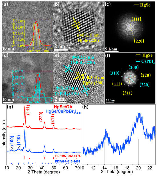 As depicted in Figure 2g, the sphalerite crystal structure of HgSe CQDs remained intact before and after the ligand exchange, indicating that our employed liquid phase ligand exchange method did not disrupt the original crystal structure [18]. The grazing incidence X-ray diffraction (GIXRD) pattern of the HgSe/CsPbBrxI3−x film showed an additional but weak CsPbBrxI3−x signal compared with the OA-capped HgSe CQD film; the weakness may be due to the low concentration or non-ideal crystallization of CsPbBrxI3−x [19]. Through amplification and comparative analysis, it is evident from Figure 2h that compared with the standard contrast card of pure phase CsPbI3 perovskite, the measured diffraction peak at 0.16° shifted towards a larger angle, suggesting partial replacement of I atoms by Br atoms with a smaller radius, resulting in a lattice expansion. A small quantity of bromine atoms instead of iodine atoms was also favorable for the stable existence of our perovskite matrix in the natural environment. By applying Bragg’s law ( and ) [20], it was calculated that the lattice constant of the perovskite within the heterostructure that formed after ligand exchange was 6.182 Å (Table S1), whereas the lattice constant of the synthesized HgSe quantum dots measured 6.086 Å. The resulting lattice mismatch between these two materials amounted to approximately 1.5%, thereby demonstrating the potential for the epitaxial growth of CsPbBrxI3−x around HgSe CQDs.
