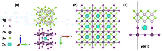(a) The crystal structures of HgSe and CsPbI3. (b) Top view of the HgSe/CsPbI3 structure (001) surface. (c) Side view of the HgSe/CsPbI3 structure (001) surface.