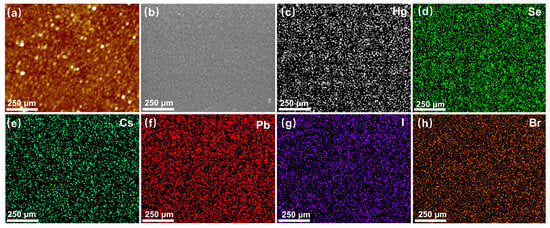 The AFM and FESEM images in Figure 4a,b demonstrate the compact surface, uniform grain size, and relatively flat nature of the HgSe/CsPbBrxI3−x quantum dot film after ligand exchange. The EDS element mapping in Figure 4c–h reveals that following ligand exchange, the HgSe/CsPbBrxI3−x quantum dot film exhibited an even distribution of Hg, Se, Cs, Pb, I, and Br elements throughout the film.