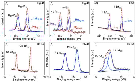 (a) The XPS spectra of Hg-4f orbitals of the HgSe/OA film. (b–f) XPS spectra of Hg-4f, I 3d, Cs 3d, Pb 4f, and Br 3d of HgSe/CsPbBrxI3−x films.