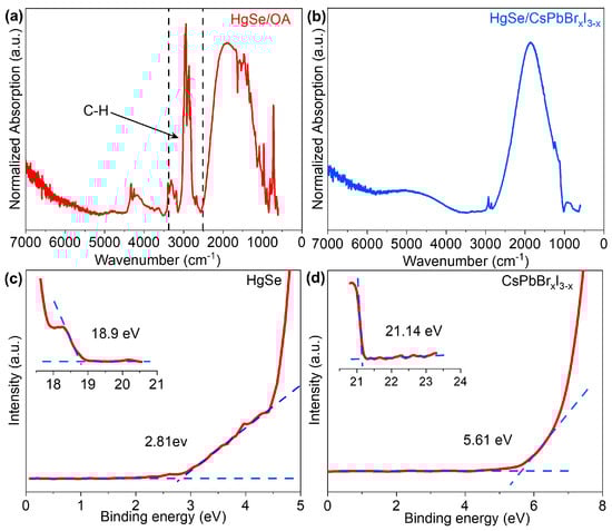 Figure 6a,b depicts the infrared absorption spectra of HgSe/OA and HgSe/CsPbBrxI3−x, respectively. The presence of an intraband absorption peak in the range of 1000~2500 cm−1 for HgSe/OA quantum dots signified stable doping, while interband absorption occurred at higher energies [31,32]. The characteristic organic peak associated with OA ligands was observed around 3000 cm−1 [33]. After the ligand exchange in the liquid phase, there was minimal alteration observed in the absorption peak of HgSe/CsPbBrxI3−x. However, a significant reduction was observed in the characteristic organic peak of OA ligands around 3000 cm−1. The observation underscored that subsequent to the establishment of the HgSe/CsPbBrxI3−x heterostructures, the OA ligands present on the surface of the CQDs were entirely supplanted.