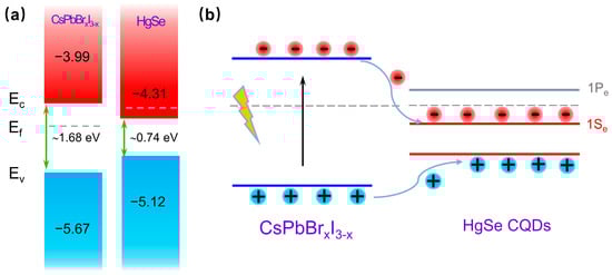 Through a comprehensive analysis of the infrared absorption and UPS data, the precise energy band alignment of the HgSe/CsPbBrxI3−x heterostructures was meticulously defined. Owing to the fact that the bandgap of HgSe CQDs was significantly narrower than that of CsPbBrxI3−x, forming a type-I band structure that was expected to be constrained by the holes and electrons of the larger band gap CsPbBrxI3−x [36,37] (Figure 7a). When the perovskite was excited by photon energy exceeding its band gap, photogenerated carriers were generated in the perovskite and transferred from the CsPbBrxI3−x to HgSe CQDs (Figure 7b).