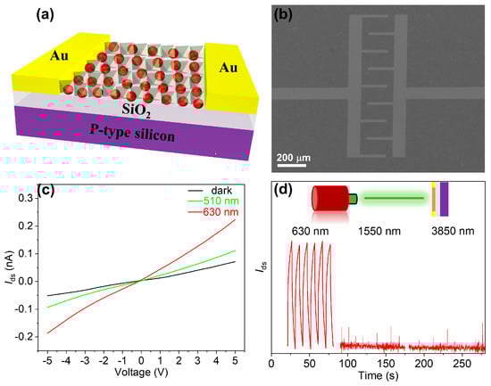 In order to investigate the photogenerated carrier transport properties in materials exhibiting type-I structures, a photoconductive device was fabricated. Schematic illustrations of the device structure are presented in Figure 8a,b. The device demonstrated an exceptional response to the visible light spectrum (Figure 8c), primarily attributed to its utilization of perovskite materials. Through a comparative analysis of the device’s on–off characteristics, it was evident that perovskite showed a remarkably swift response owing to its elevated carrier mobility, thereby resulting in a square waveform switching curve (Figure S3). Conversely, for devices based on HgSe/CsPbBrxI3−x type-I heterostructures, illumination with a visible light spectrum induced the transfer of carriers generated within the perovskite matrix into HgSe quantum dots. Consequently, the carrier lifetime experienced a significant enhancement within the visible spectral range of the device. This phenomenon was evident in the switch curve as it exhibited a deceleration in response time and deviated from its typical square wave. At an ambient temperature, HgSe CQDs exhibited an exceptional detection performance within the 1550 nm wavelength range and could also achieve efficient mid-wave infrared detection at low temperatures [38,39]. Conversely, the HgSe/CsPbBrxI3−x devices exhibited a complete loss of infrared detection functionality (Figure 8d), a phenomenon that underscored the pronounced effect of carrier confinement within the type-I heterostructures engendered by photogenerated carriers [40].