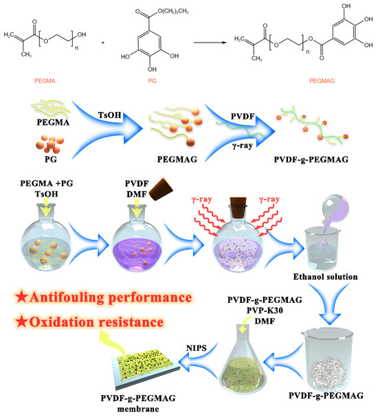 In this study, the PG segment was initially bonded to the PEGMA molecule through a transesterification process. Subsequently, this complex was grafted onto PVDF using a homogeneous radiation grafting technique to create PVDF-g-PEGMAG, which incorporates both antioxidant (PG segment) and antifouling (PEGMA segment) functionalities.