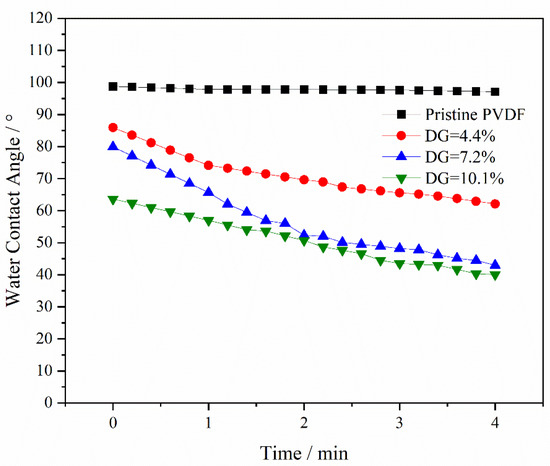 Dynamic water contact angles of pristine PVDF and PVDF-g-PEGMAG membranes with different DG.