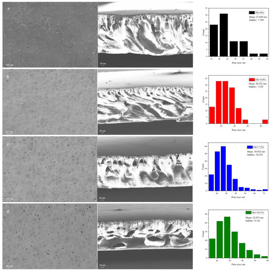 SEM images of membrane surface and cross-section with different grafting ratios: (a) DG = 0, (b) DG = 4.4%, (c) DG = 7.2%, (d) DG = 10.1%. (The rightmost is the square distribution of the membrane pore size calculated by ImageJ based on the SEM membrane surface image).