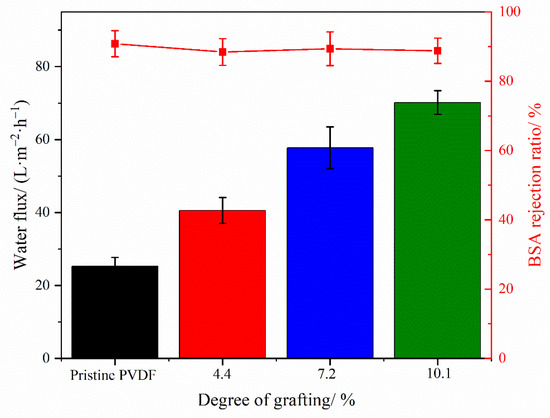 In recent years, numerous studies have proposed various modification methods to alleviate membrane fouling issues, such as modification with inorganic ion exchangers, oxidation of graphene, metal–organic frameworks (MOFs), and others [19,20,21,22,23,24]. Polyvinylidene fluoride (PVDF) is a commonly used material for ultrafiltration membranes. There are many research works that highlight the significant improvement in fouling resistance when PVDF undergoes PEGylation, enhancing the performance of membranes fabricated from this material [25,26,27,28]. Wang et al. [25] employed the oxidative strength of ozone to activate PVDF, creating peroxides. This step was crucial for initiating the free radical graft polymerization process, which facilitated the grafting of polyethylene glycol methacrylate (PEGMA) onto the PVDF structure. Such a modification markedly improved the membrane’s capacity to repel protein adsorption. Through the utilization of Atom Transfer Radical Polymerization (ATRP), Hester [26] and Liu et al. [27] developed PVDF-g-PEGMA. Additionally, Liu et al. [27] successfully constructed a PVDF/PVDF-g-PEGMA filtration membrane with exemplary antifouling characteristics and devoid of any defects by incorporating the grafted polymer as a functional additive. Previous explorations by our research group [28] have demonstrated the efficacious grafting of methoxy polyethylene glycol acrylate (mPEGA) onto PVDF, employing it as a PEG monomer via a homogeneous radiation grafting technique. This grafted composite was directly utilized in membrane formation, showcasing a water flux recovery rate that consistently remained above 90% across three fouling cycles. Furthermore, there are studies that have also delved into improving the hydrophilicity and antifouling capabilities of PVDF membranes through the strategic incorporation of PEGylation during the surface grafting [29,30,31,32] and the membrane fabrication process [33], thus underscoring the importance of PEGylation in enhancing membrane functionality.