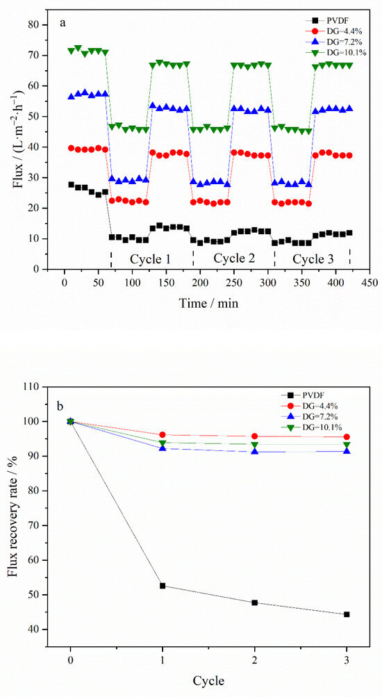 In this study, an in situ measurement technique was employed, integrating online cleaning of the membrane via a cross-flow filtration method. This process entailed alter-nating the fluid composition, specifically switching between water and a BSA solution. Figure 7 illustrates the results from antifouling cycle tests on membranes with varying DG. Specifically, Figure 7a depicts the fouling and cleaning flux of the membrane across multiple cycles, whereas Figure 7b presents the FRR derived from the data in Figure 7a. During the cleaning phase, consistent trends in flux variation were observed among different modified membranes, with a notable increase in flux upon switching the feed to pure water. After three cycles (420 min) of testing, the flux of pure water post-cleaning remained relatively unchanged, with only a minor reduction observed during the initial cycle. Conversely, the pristine PVDF membrane exhibited a significant flux decline upon the initial switch to pure water. Furthermore, the FRR values calculated from the flux data indicated a significant decrease in the FRR of the pristine PVDF membrane during the first cycle, with a continued decline over the subsequent two cycles. In contrast, the FRRs for the modified membranes consistently exceeded 90% and remained stable through later cycles, suggesting that higher FRR values correlate with enhanced membrane stability and superior antifouling performance. The antifouling cycle tests comprehensively demonstrate the superior antifouling capabilities of the modified membranes.