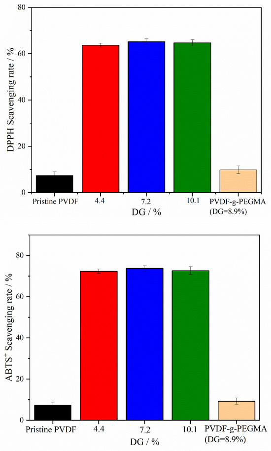 Figure 8 demonstrates the efficiency of different types of membranes in scavenging DPPH and ABTS+ free radicals. The membranes modified with PG segments, PVDF-g-PEGMAG, showcased a significantly higher free radical scavenging capacity compared to both the pristine PVDF and the PVDF-g-PEGMA. This superior scavenging ability highlights the impactful role of the PG segments in enhancing the membrane’s antioxidative properties. Furthermore, variations in the grafting rate appeared to have a minimal impact on the membranes’ ability to neutralize free radicals. This observation could be attributed to the fact that the grafting rate mentioned in this study reflects the combined grafting of both PG and PEGMA segments onto the membrane. During the synthesis of the grafted polymer with a DG of 10.1%, a larger quantity of PEGMA segments was introduced onto the PVDF chain compared to PEGMAG, due to the higher proportion of PEGMA, thereby leading to a slight decrease in the membrane’s free radical scavenging rate compared to the membrane with DG = 7.2%.