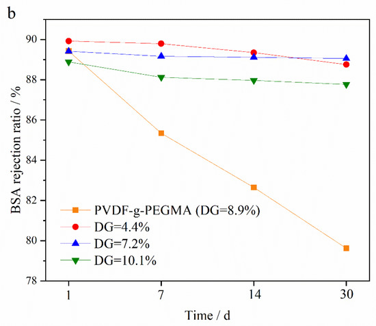 The membrane of the grafted polymer was fabricated by employing the NIPS method. Analysis of the membrane’s surface and cross-section via SEM alongside water contact angle measurements revealed that the hydrophilicity of the membrane enhanced as the DG increased. The pore size of the membrane increased with the increase in grafting rate. Specifically, for the modified membrane with a grafting rate of 10.1%, the pore size expands from 27.650 nm in the original PVDF membrane to 32.072 nm. Additionally, after a duration of 4 min, the water contact angle of the membrane could decrease to as low as 40.1°. Cyclic flux testing of the membrane indicated that introducing the PG segment to the modified membrane did not detract from the excellent antifouling capabilities inherent to PEGylated PVDF membranes. In tests of circulation flux across membranes with varying DG, the FRR consistently exceeded 90%. Moreover, the antioxidant performance tests demonstrated that the modified membrane retained its capacity to scavenge DPPH and ABTS+ free radicals, with its efficacy largely unaffected by prolonged immersion in water. After soaking in pure water for 30 days, the modified membrane exhibited only a slight decrease in scavenging rates for both DPPH and ABTS+ free radicals, maintaining them at above 60% and 70%, respectively. Additionally, the PG grafting significantly bolstered the membrane’s resistance to oxidation, enabling it to maintain antifouling performance; even after a 30-day immersion in a NaClO solution, the flux recovery rate remained above 95%, thus illustrating the membrane’s durability against oxidation during chemical cleaning processes.