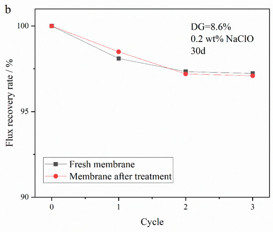 To investigate the influence of an oxidizing agent on membranes post-grafting of PG segments, membranes, including PVDF-g-PEGMA (with a DG of 8.9%) and PVDF-g-PEGMAG with various DG, were immersed in a sodium hypochlorite (NaClO) solution (2 wt.%) for a set duration. The impact on membrane filtration performance was assessed through variations in water flux and bovine serum albumin (BSA) rejection rate over time. Previous reports on the effect of hypochlorite treatment on UF membranes indicated a flux increase in NaClO-treated membranes [12,14]. Specifically, the PVDF-g-PEGMAG membrane with a DG of 8.6% was analyzed to compare its circulation flux before and after a 30-day immersion in NaClO solution. The antifouling efficacy of the membrane was appraised by comparing the FRR before and after the 30-day exposure to oxidation. Figure 10 reveals that, after 30 days of exposure to the oxidizing environment, the water flux through the PVDF-g-PEGMA membrane increased, while its BSA rejection rate dropped below 80%, indicating a significant detriment to its filtration performance due to oxidation. Conversely, the water flux and BSA rejection rates for PVDF-g-PEGMAG membranes with various DG remained largely stable after the 30-day oxidation period. This suggests that the PG segment grafting effectively mitigated the oxidation impact on PEGylated PVDF membranes. Figure 11 displays the antifouling cycle test results for the PVDF-g-PEGMAG membrane with a DG of 8.6%, both before and after undergoing oxidation treatment for 30 days. It is observed that the flux of the membrane post-oxidation closely mirrors the FRR prior to oxidation, maintaining stability across three cycles. This outcome indicates that the antifouling properties of the modified membrane were well-preserved even after 30 days of exposure to oxidizing conditions.