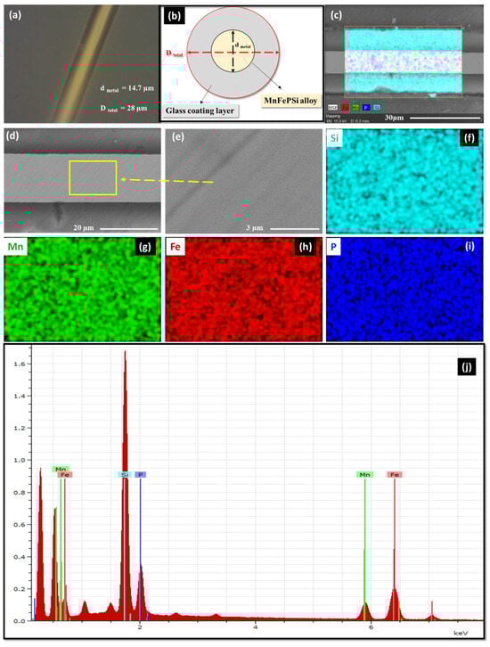 (a) The optical microscope image of MnFePSi-glass-coated microwires and (b) sketch of MnFePSi-glass-coated microwire. (c–i) SEM image of MnFePSi-glass-coated microwires and the EDX elements (Si, Mn, Fe and P) mapping; (j) the EDX spectra for one point.